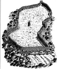 Torre e iglesia. Según los estudios detallados de los restos, así pudo ser en realidad la ermita, donde se aprecia el ábside y la torre, esta última de dos alturas.