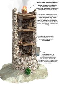 Representación gráfica de una torre vigía, con sus diferentes cavidades. El centinela accedía a la planta baja por una puerta en altura, para dificultar los asaltos. En las plantas intermedias se almacenaban las armas, leña, provisiones, etc. La última planta se destinaba a la vigilancia a larga distancia y al envio de señales a otras torres mediante señales de fuego.